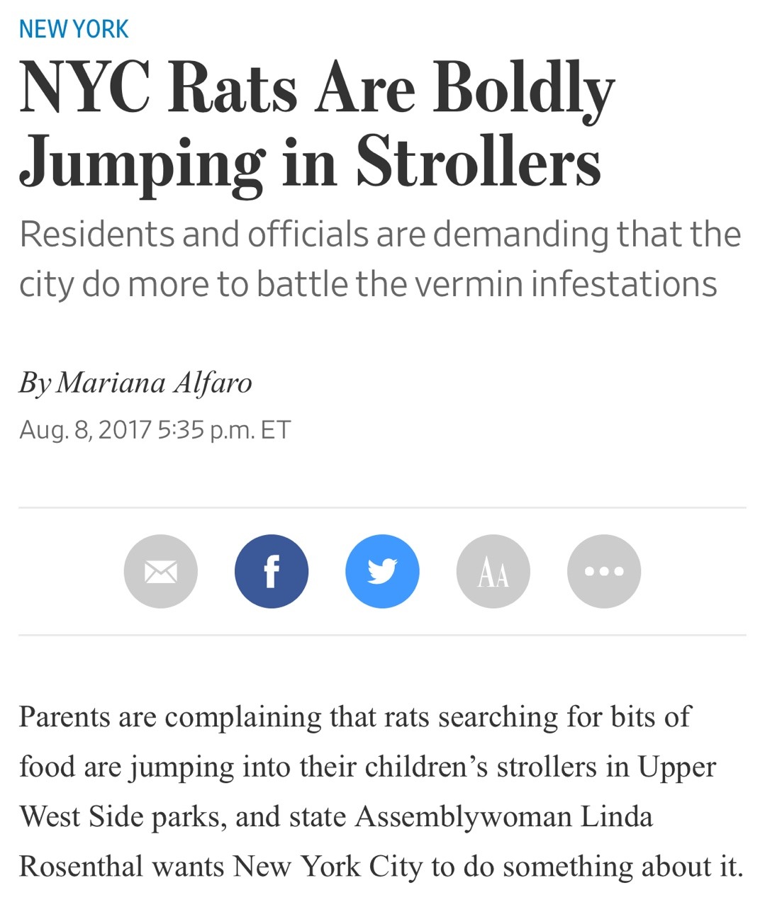 i am absolutely losing my mind over this article imagine living in the upper west side literally paying millions of dollars for a luxury apartment in the richest part of the greatest city in the world, you walk out of your complex with your thousand dollar stroller so connor or hunter or ashlyn can get some fresh air before their scheduled paleo snack when suddenly a fucking rat leaps into the thing like its being thrown by a stagehand in the bushes, a goblin achieving flight for a fraction of a second, scampering around in the shit and slime of the street and now its in your trust fund childs lap i am LIVING, new york freakin city babey!!!!!!!!!!!
